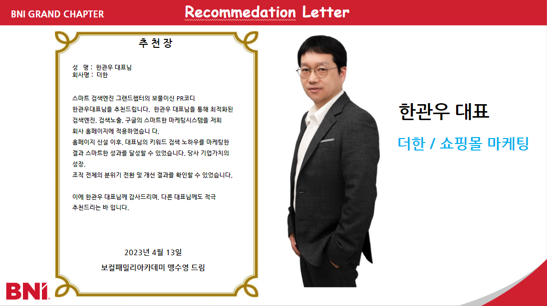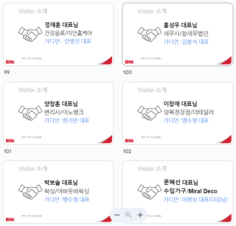 | BNI 그랜드 챕터 주간회의 기버스게인 비즈니스 CEO 모임 20230511 (1) | 2023.05.19 |