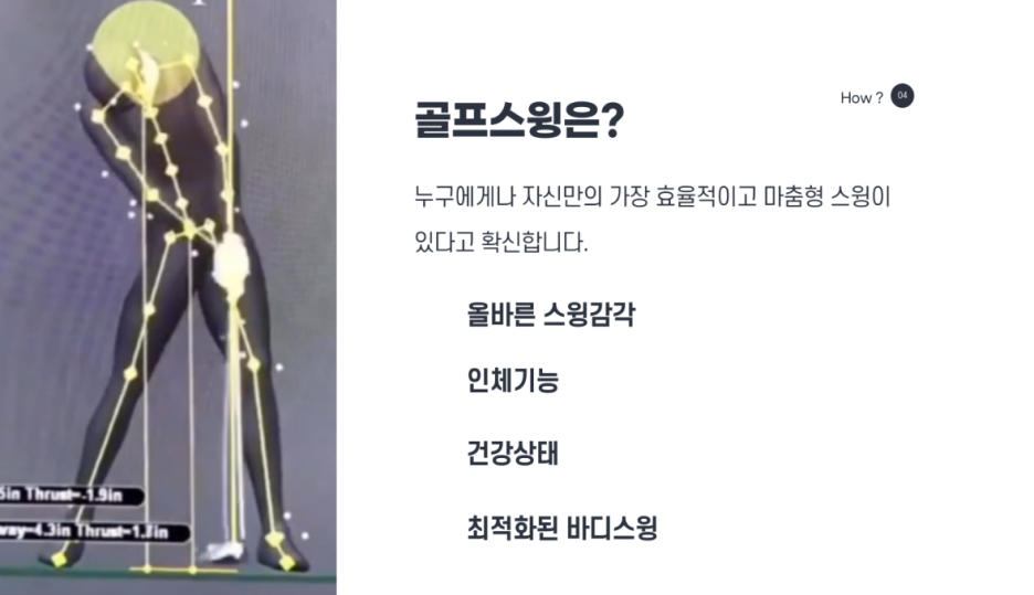 각 개인의 신체와 건강상태에 맞춰서 개인형 최적환된 바디스윙을 제안합니다.