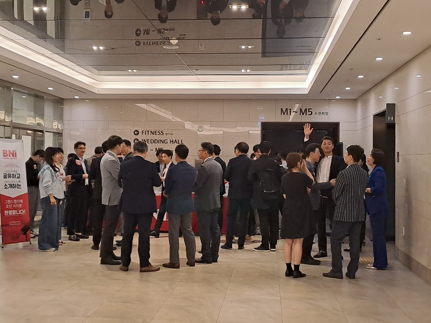 굿모닝 비엔아이 굿모닝 그랜드 밀리토피아 호텔 회의장 로비가 가득 찼네요.