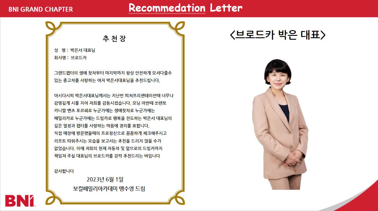 브로드카 중고차 박은서 대표님을 추천합니다. 발표하는 맹수영 대표님