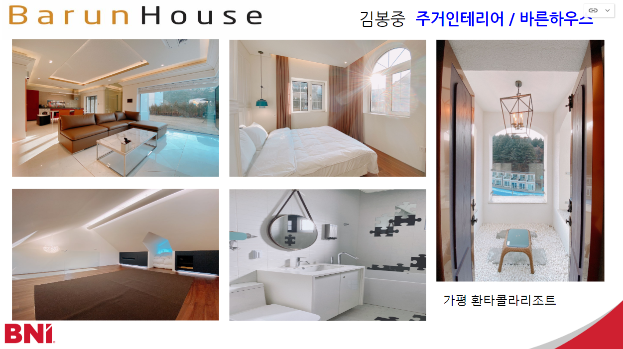 주거인테리어 바른하우스 김봉중대표님이 가평환타콜라리조트를 7년전에 공사를 했으며 ~~~ 자신의 리퍼럴을 찾고 있습니다.