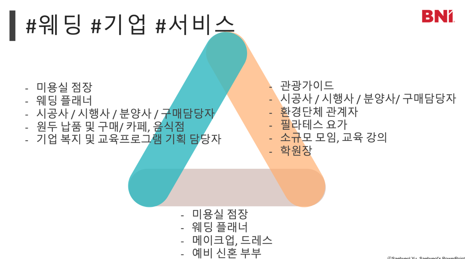 BNI는 멤버 상호간에 오래 지속되는 신뢰관계를 만들어서 서로 비즈니스를 소개해 주는 시스템 입니다.