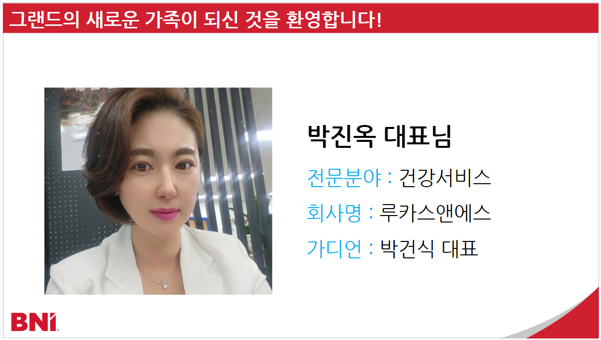 박진옥대표님 루카스앤에스 / 건강서비스 그랜드 챕터의 새로운 멤버가 되신 것을 환영합니다.