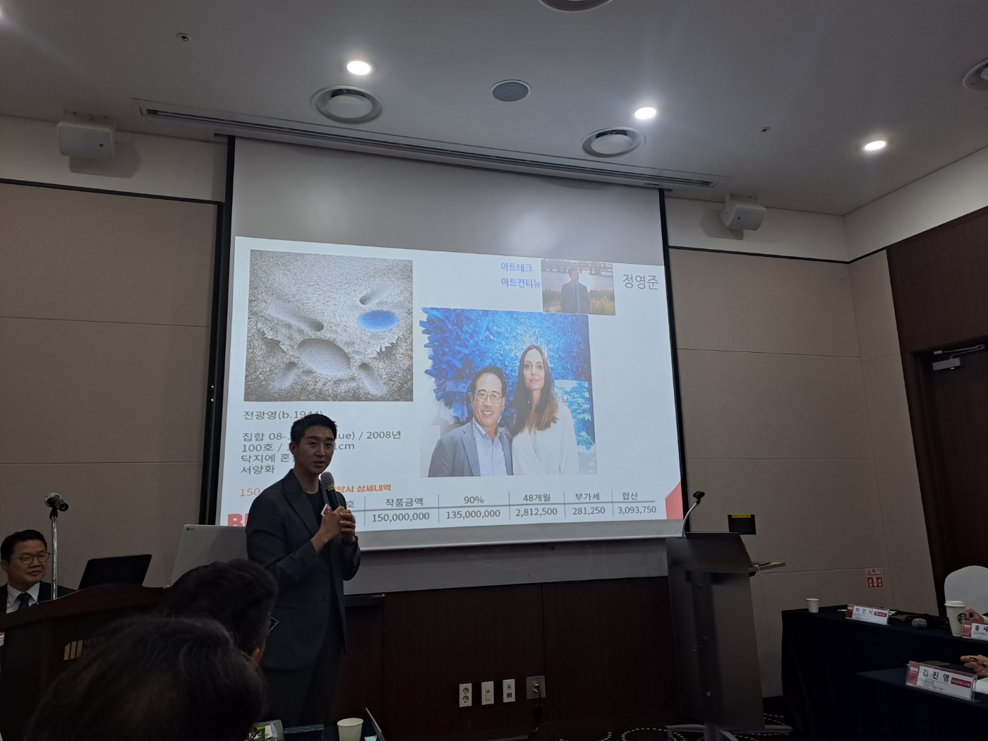 아트테크 정영준 대표의 전광연작가님의 작품을 설명하고 있습니다.