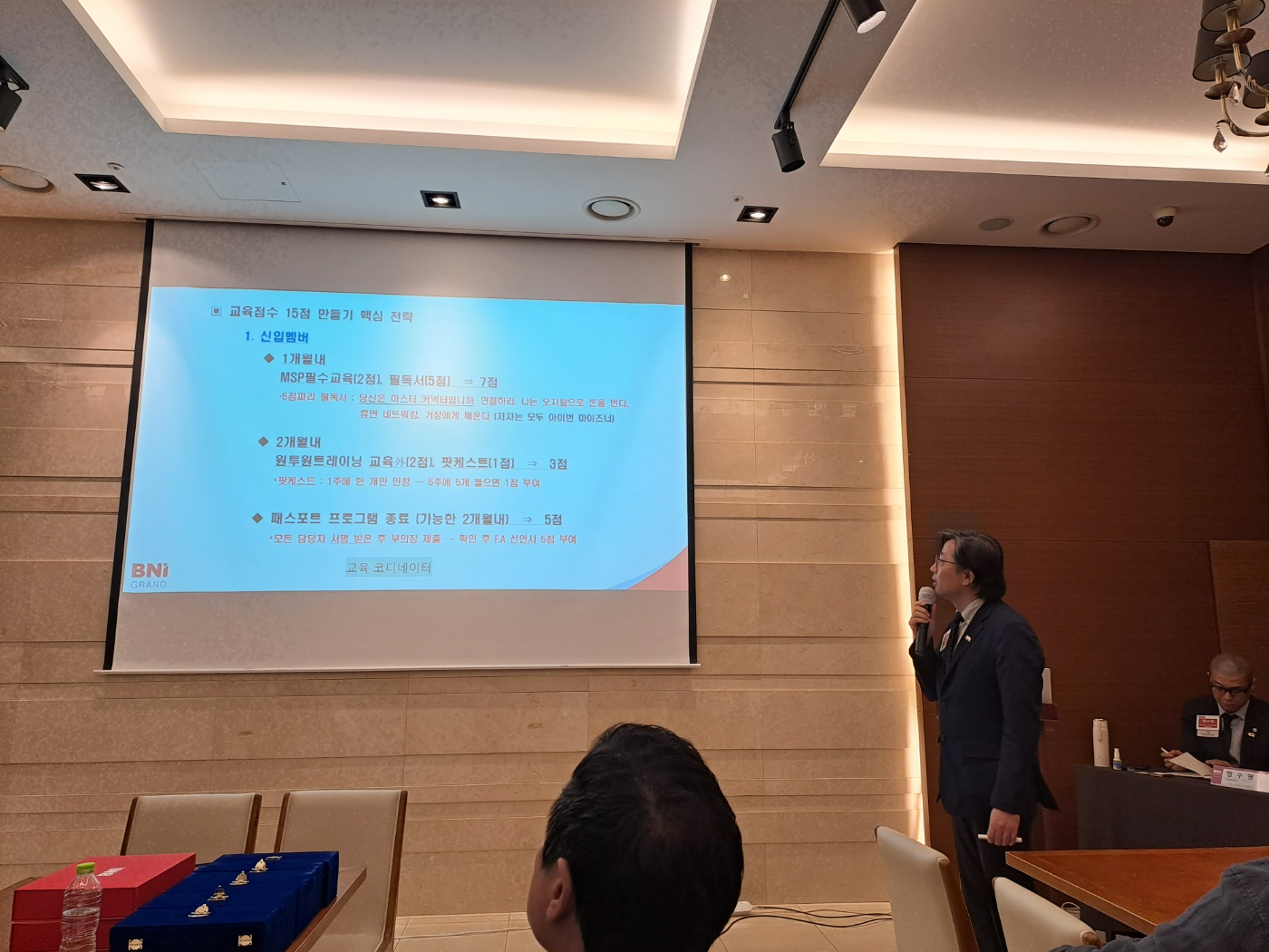 교육코디네이터로 기여해주시는 부동산 건축 주)포스트건설산업 신익호 대표님의 전 멤버 교육점시 15점(만점) 만들기 핵심전략을 발표하고 있습니다.