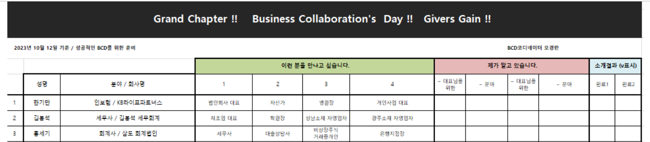 우리 멤버들은 우리의 주요 핵심 가치인 기버스 게인 Givers Gain에 대한 헌신을 통해 다른 사람의 비즈니스를 키우는 데에 도움을 주는 비즈니스 전문가들의 모임입니다.