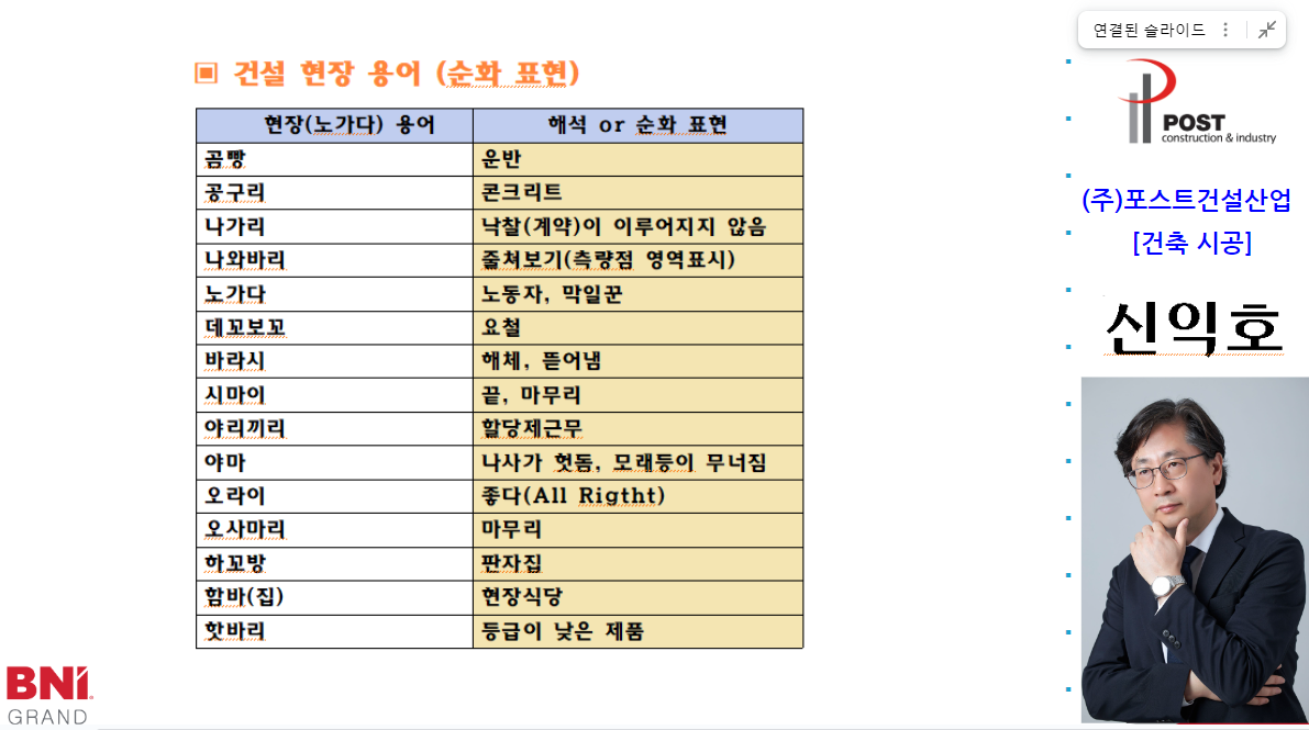 꿈을 지어드리는 포스트건설산업 건축시공 신익호 대표님의 건설현장 현장용어를 순화하여 설명해주셨습니다.