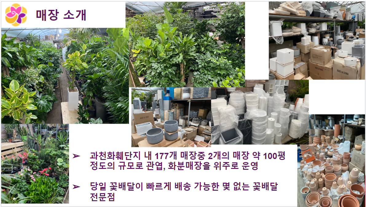 26년간 과천화훼단지 내 177개 매장주에 약 100평 정도의 규모로 관엽식물과 화분을 전문으로 취급합니다.