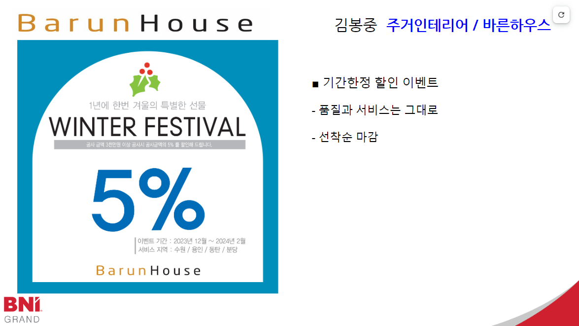 | 그랜드챕터 주간회의 미랄데코 수입가구전문점 문혜선대표 피쳐프레젠테이션 bni 사업가 모임 20231012 (0) | 2023.10.12 |
