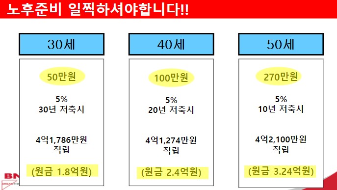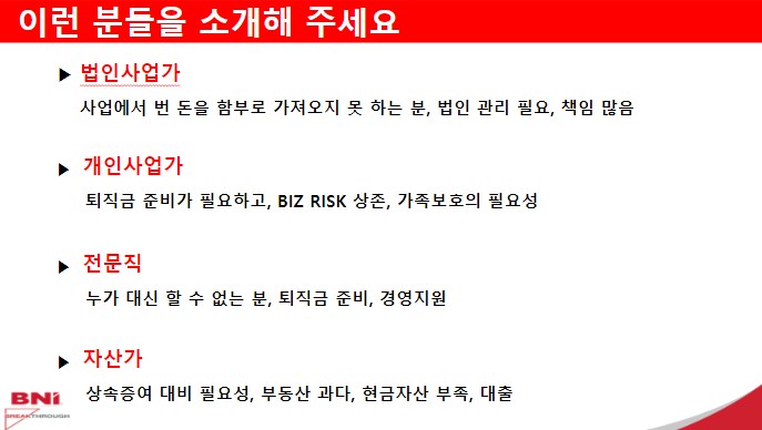 - 전문직 : 누가 대신 할 수 없는 일을 하고 계시는 분, 퇴직금 준비, 경영에 필요한 지원 등