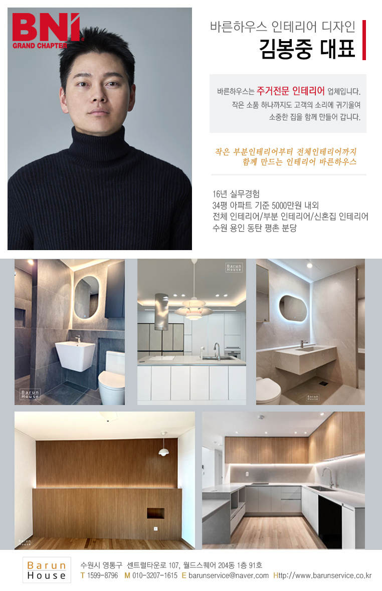 - 한샘 출신 주거 전문 인테리어 업체입니다. 신축 아파트 인테리어가 필요하다면 바른하우스의 김봉중 대표를 찾아주세요.