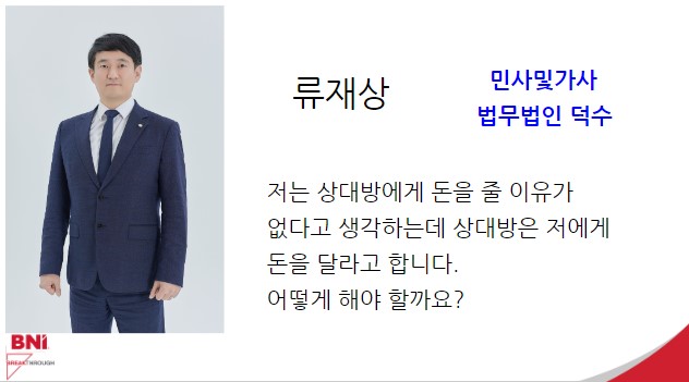 - 민사 부동산 변호사를 하고 있는 법무법인 덕수 - 류재상 대표 입니다. 돈을 주지 않아도 되는데 상대측에서 계속 돈을 요구한다면 류재상 변호사를 찾아주세요.
