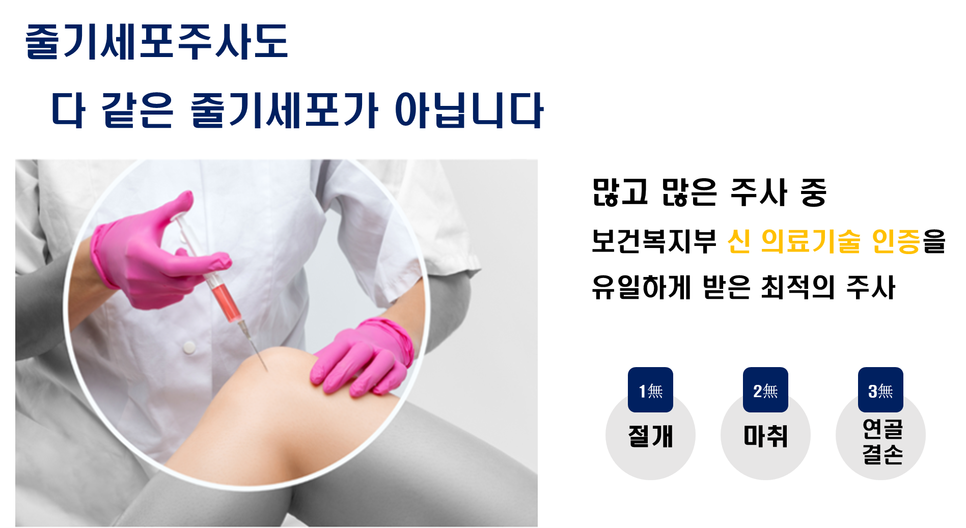 많고 많은 주사 중 보건복지부에서 신 의료기술 인증을 유일하게 받은 최적의 주사인 줄기세포주사 입니다.