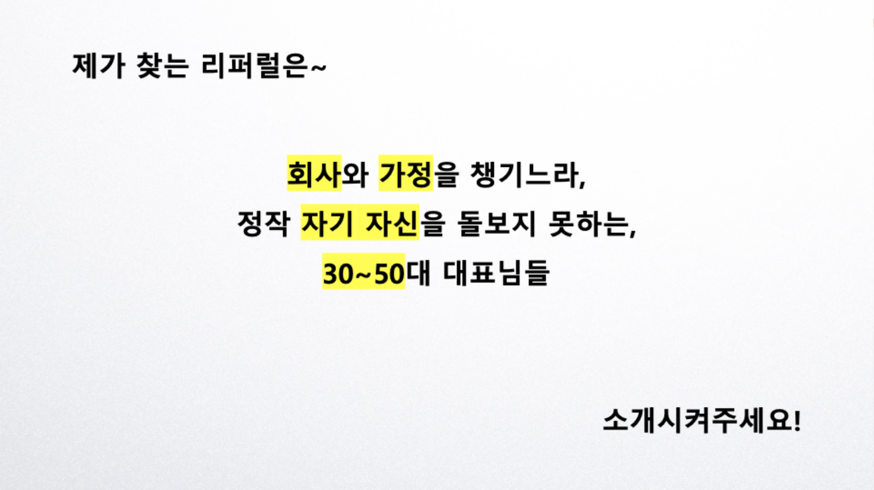 우리는 매주 자신이 현재 찾고 있는 리퍼럴을 40초 내에 설명하는 위클리 프레젠테이션을 진행합니다.