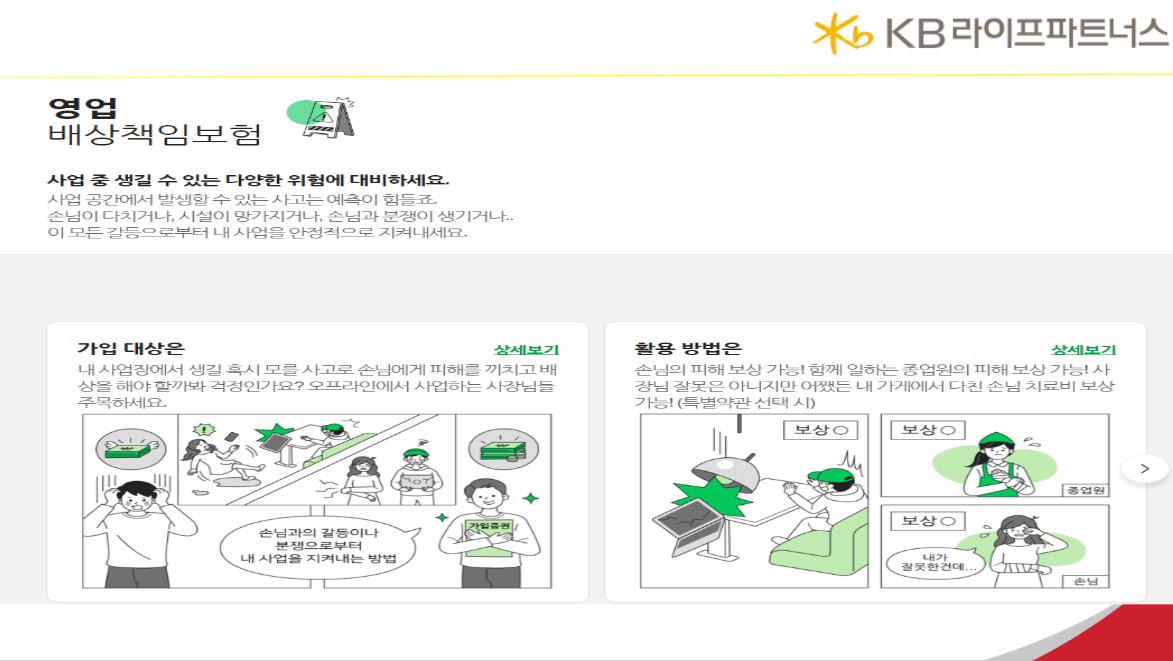사업 공간에서 사고중 손님이 다치거나, 시설이 망가지거나, 손님과 분쟁이 생기거나 등 여러 가지 갈등으로부터 내 사업을 안정적으로 지켜낼 수 있도록 해주는 보험 입니다.