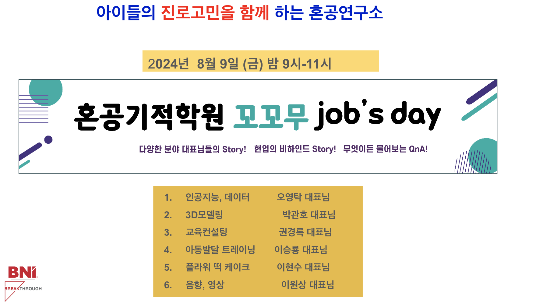 - 아이들의 진로 고민을 함께 해결하기 위해 혼공연구소에서 개최하는 BNI 멤버 분들이 직접 자신의 직업에 대해 강연하는 시간이 있습니다. 이처럼 공부는 물론이고 학생들의 진로까지 많은 고민을 하는 혼공연구소에 많은 관심 부탁드립니다.