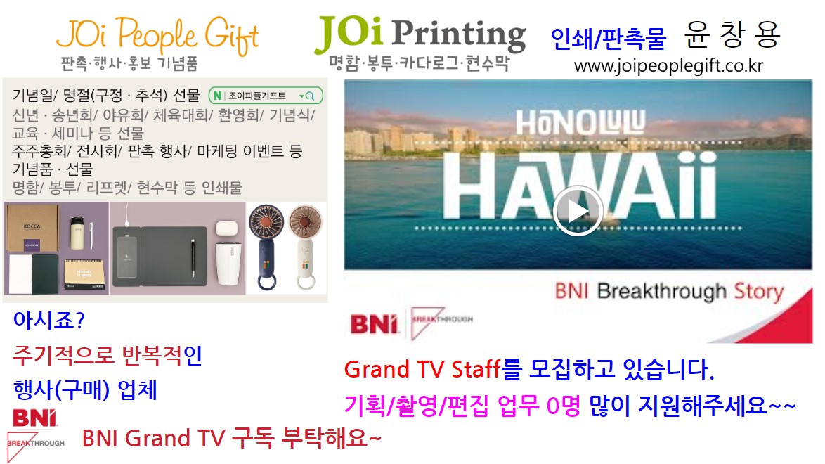 추가로 BNI그랜드챕터 유튜브 채널 개설 하였습니다. 좋은 컨텐츠로 찾아 뵐테니 많은 관심 부탁드립니다.